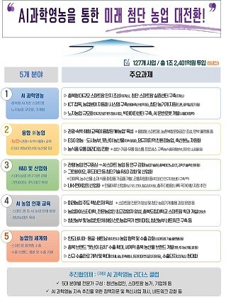 충북도는 지난 2월 5일 미래 첨단농업으로의 대전환을 위한 「AI 과학영농 원년, 2024」선포식을 개최하였으며, 이를 위해 5대 분야 127개 사업을 본격적으로 추진해 나가겠다고 밝혔다.