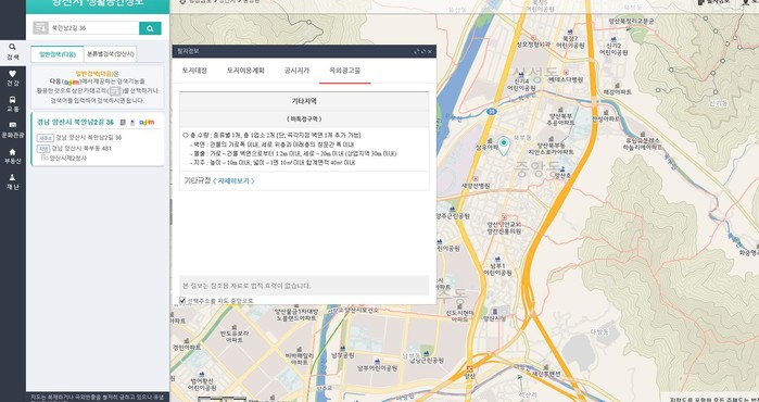 양산시 생활공간정보 홈페이지(http://uis.yangsan.go.kr/)에서 ‘주소검색 후 해당 주소의 필지정보를 클릭하면 옥외광고물 설치기준 정보를 볼 수 있다.