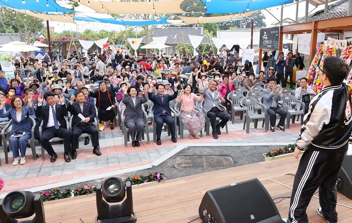 | ▲ 강진원 강진군수(앞줄 왼 쪽부터 다섯 번째)를 비롯한 김보미 강진군의회 의장(네 번째) 등 군 관계자, 관광객, 지역주민 등이 불타는 금요일은 불고기 파티 불금불파 축제를 즐기고 있다. / 자료사진 = 강진군 제공 |