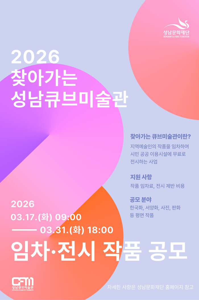 [성남=오왕석 기자] 성남문화재단(대표이사 윤정국)은 지역예술인의 창작 환경 지원을 다각화하고 시민들의 문화예술 향유기회를 확대하고자 ‘2026 찾아가는 성남큐브미술관’ 작품 임차 공모를 진행한다.
