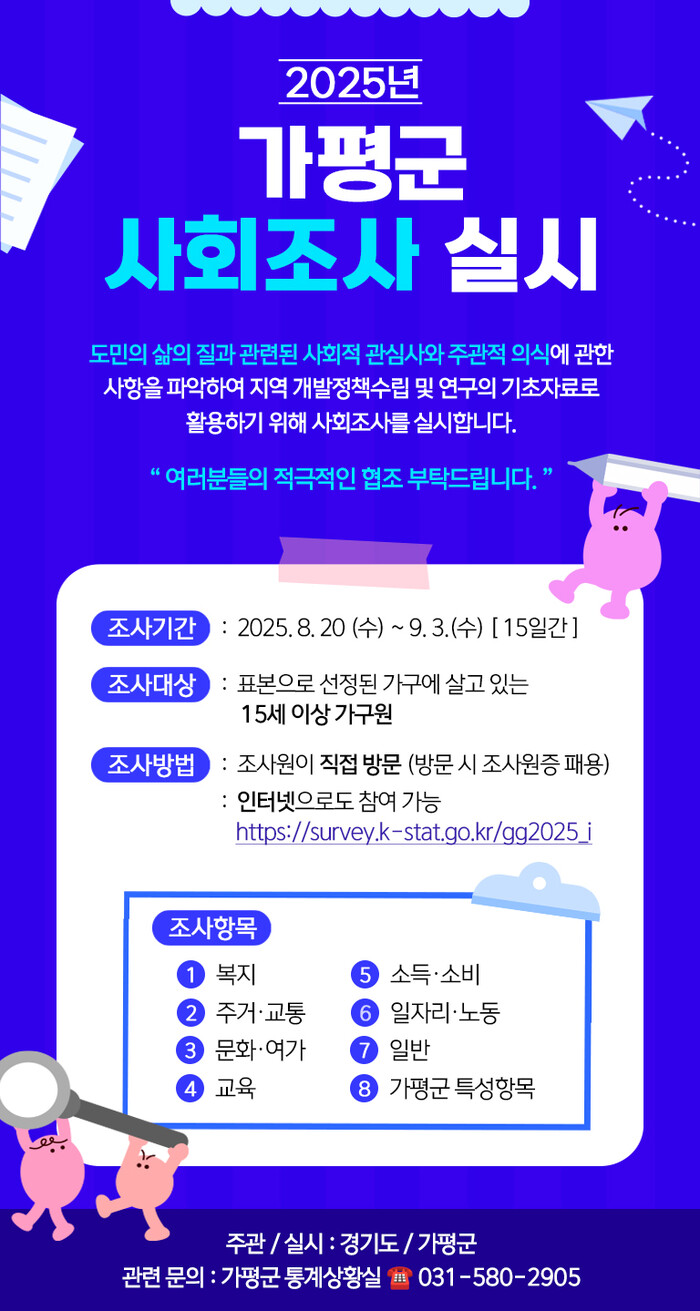 가평군 관계자는 “사회조사를 통해 수집된 자료는 비밀이 철저히 보장되며 통계 작성 목적으로만 활용된다”며 “군민 여러분의 성실한 응답은 향후 맞춤형 정책 수립의 밑거름이 되므로 적극적인 협조를 부탁드린다”고 말했다.