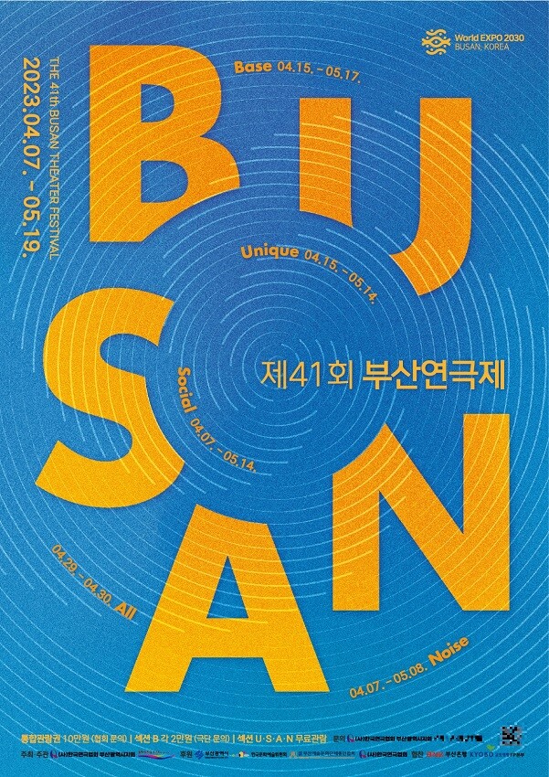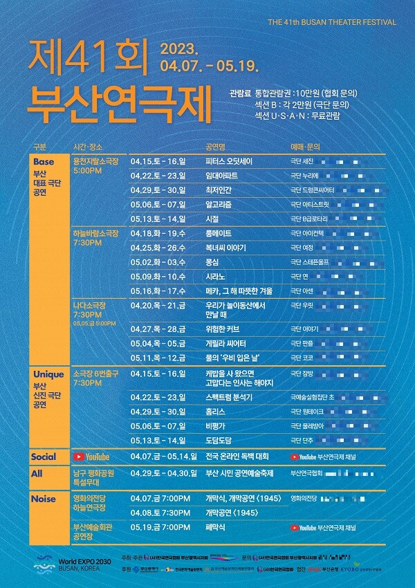 이번 행사는 4월7일 부산 영화의전당 하늘연극장에서 개막식을 가지고, 개막공연 <1945>로 부산연극제의 시작을 알린다. 5월 19일까지 40여일간 부산지역의 6개 공연장과 남구 평화공원, 유튜브 채널에서 함께 할 수 있다.