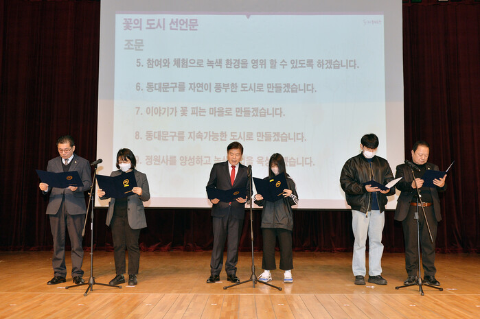 | ▲ 꽃의 도시 선언식에 참석한 이필형 구청장(왼쪽 세 번째)이 참여자들과 꽃의 도시 선언문을 읽고 있다.(사진=동대문구청 제공) |