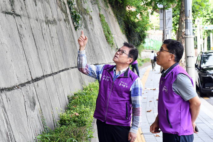 | ▲ 이 구청장(왼쪽)이 옹벽을 점검하고 있다. |