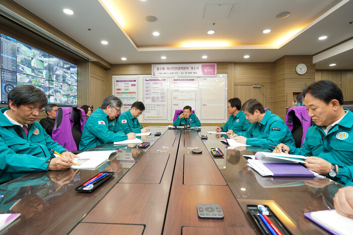 | ▲ 풍수해 재난안전 대책본부 개소식 참석한 이필형 구청장(가운데)의 모습.(사진=동대문구청 제공) |
