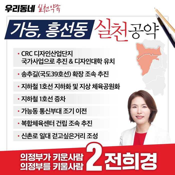 [시민일보 = 민장홍 기자] 전희경 국민의힘 의정부갑 후보가 ▲CRC (캠프레드클라우드) 디자인산업단지 국가사업화 추진 & 디자인대학 유치 ▲송추길(국도39호선) 확장 조속 추진 ▲지하철 1호선 지하화 및 지상 체육공원화 등 [가능ㆍ흥선동] 지역을 위한 7대 실천과제를 20일 공개했다.