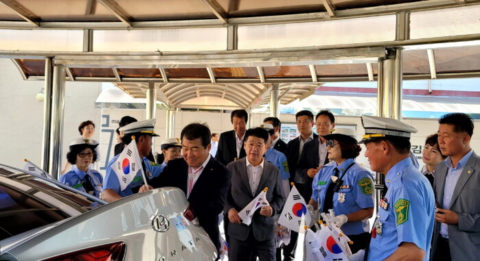 새마을교통봉사대 김천지대는 지난 15일 관내 차량 통행이 잦은 버스터미널, 김천역, 이마트 사거리, 의료원 사거리, KTX 김천구미역 등으로 이동하며 택시와 일반 승용차 등에 태극기를 달아주며 시민들이 순국선열의 희생을 기억하고 광복절의 의미를 되새기자는 캠페인 활동을 펼쳤다.