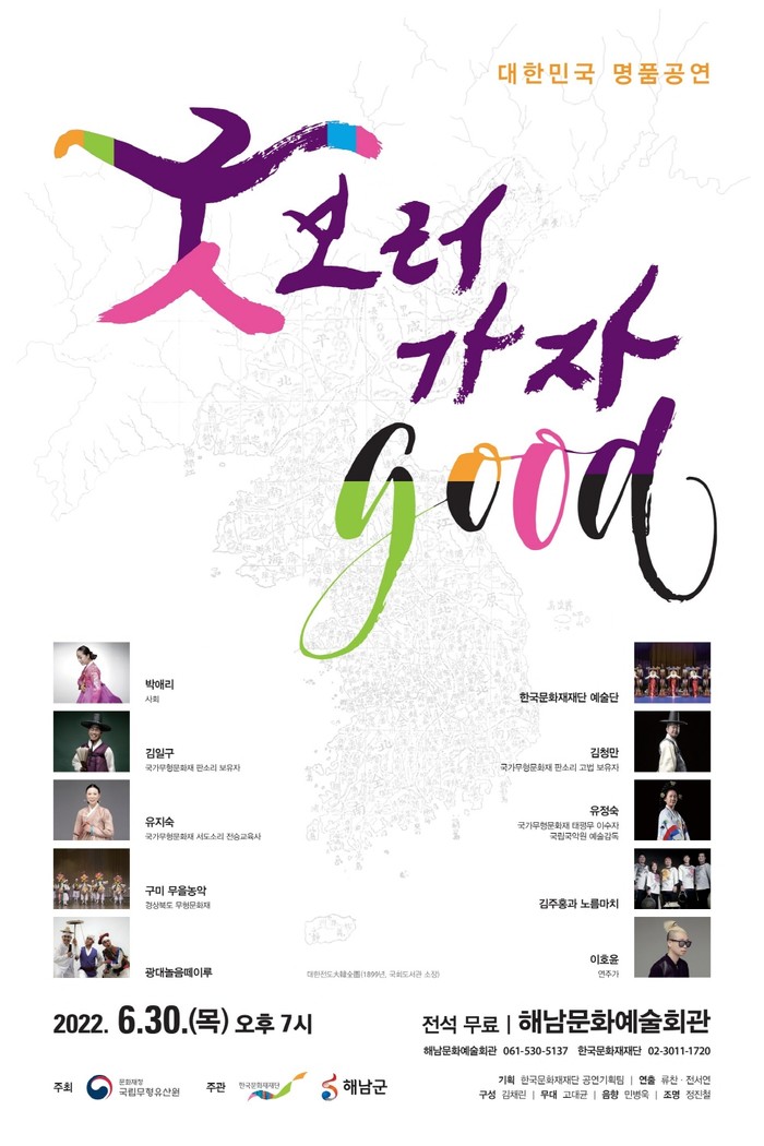 ‘굿보러가자’는 국악인 박애리의 사회로 국가무형문화재와 지역전통예술인 등 대한민국 최고의 명인을 만날 수 있는 국악 공연이다. 김일구(국가무형문화재 판소리 보유자), 김청만(국가무형문화재 판소리 고법 보유자), 유지숙(국가무형문화재 서도소리 전승교육사), 유정숙(국가무형문화재 태평무 이수자), 구미 무을농악(경상북도 무형문화재), 김주홍과 노름마치, 광대놀음 떼이루, 연주가 이호윤, 한국문화재재단 예술단이 무대에 올라 전통·퓨전국악 등 수준 높은 프로그램으로 관객을 만날 예정이다.