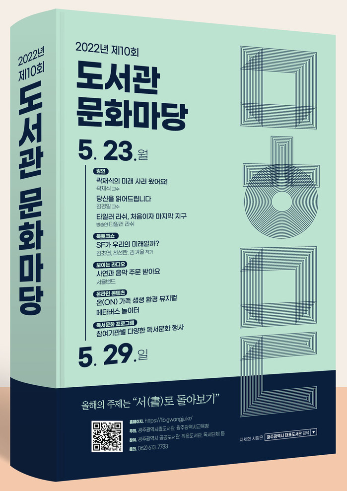 이번 행사는 광주지역 공공도서관, 작은도서관, 독서단체 등 46개 기관이 참여해 ‘서(書)로 돌아보기’를 주제로 강연, 공연, 온라인콘텐츠, 독서문화 프로그램 등 다양한 행사를 운영한다.