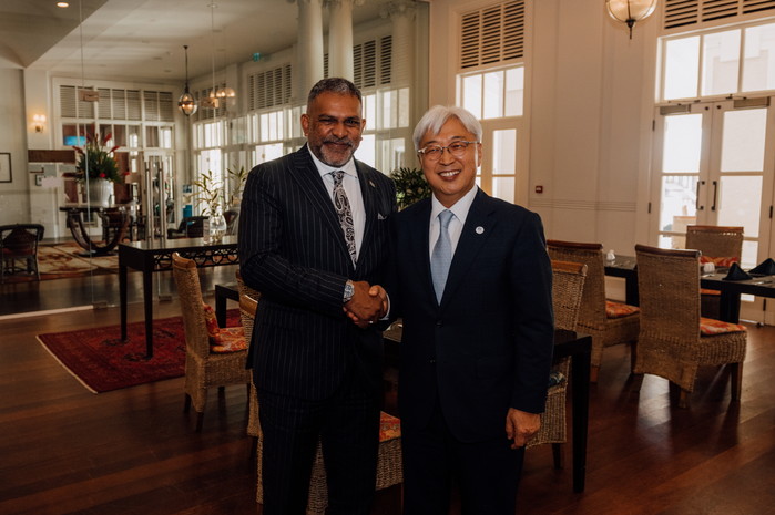 | ▲ 지난 24일(현지시간) 피지의 수도 수바에서 열린 '2022 한(韓)-피지 비즈니스 포럼'에서 삼성전자 이인용 사장(오른쪽)이 파이야즈 코야 피지 통상관광부 장관을 만나 삼성전자의 주요 활동에 대해 설명하고 '2030 부산세계박람회' 유치 지지도 당부했다.(사진제공=삼성전자) |
