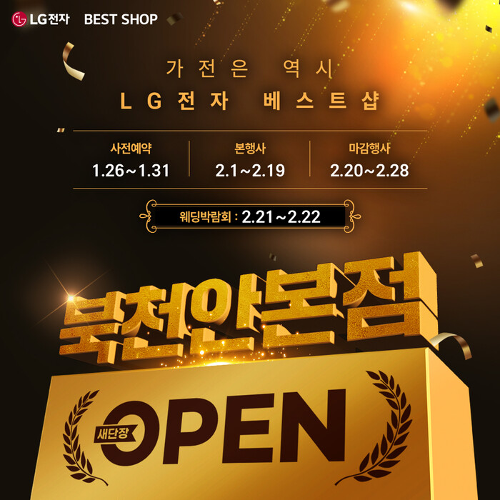 LG전자 베스트샵 북천안본점 새단장 오픈 행사는 사전행사(1월 26일~31일)를 시작으로 본행사(2월 1일~19일), 마감행사(2월 20일~28일)까지 순차적으로 운영된다. 또한 2월 21일부터 22일까지는 웨딩 고객을 대상으로 한 웨딩박람회가 함께 진행돼 혼수가전 상담을 원하는 예비부부들의 방문이 예상된다.