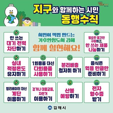 시는 지구동행수칙이 시민들의 생활 속에 널리 확산될 수 있도록 김해시 SNS, 유튜브, 현장 캠페인 등 다양한 방식으로 시민들에게 알려 나간다.