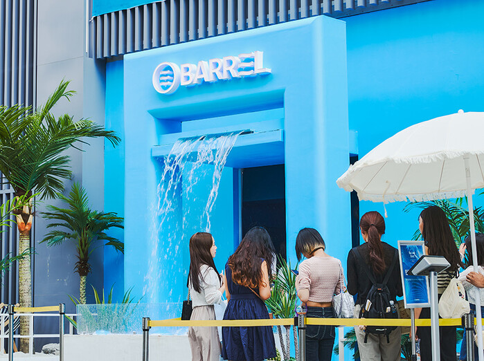배럴 팝업스토어는 리조트에서 신나는 여름휴가를 즐기는 컨셉으로, 도심에 휴양지 리조트를 그대로 옮겨왔다. 팝업스토어 외관 전면에 배럴 블루 컬러를 배경으로 인공 폭포를 설치하여 고객들의 눈길을 사로잡으며 무더운 도심 속 이색적인 포토존으로 인기를 끌었다.