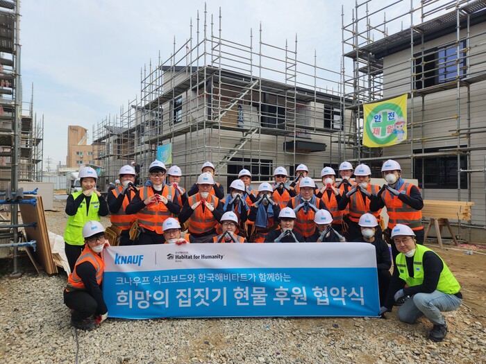 글로벌 건축자재 선도기업 크나우프 석고보드㈜는 한국해비타트의 주거환경개선사업 건축 현장에 필요한 석고보드를 전량 지원하는 협약식과 임직원들의 ‘희망의 집짓기’ 건축 봉사를 7일 충남 천안에서 진행했다.