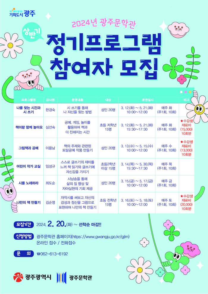 운영 기간은 3월부터 5월까지이며, 자세한 내용은 광주문학관 홈페이지를 통해 확인하거나 문학관 운영팀으로 문의하면 된다.