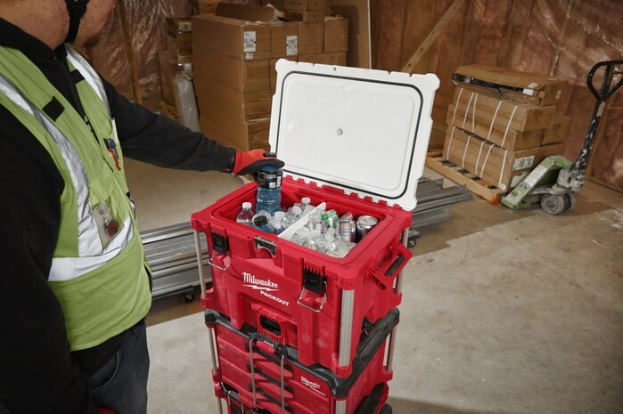 기존 밀워키 팩아웃 시스템 제품과 호환 가능하며 박스 하단 부분에 배수구가 탑재되어 있어 제품 내 액체를 쉽게 배출할 수 있다. 뿐만 아니라 제품 외부에는 오프너가 장착돼 병음료도 쉽게 마실 수 있다.