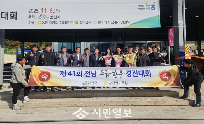 | ▲ 성전면 노양 농가, 제41회 전라남도 으뜸한우 경진대회 암송아지 부문 우수상 기념촬영 / 강진군 제공 |