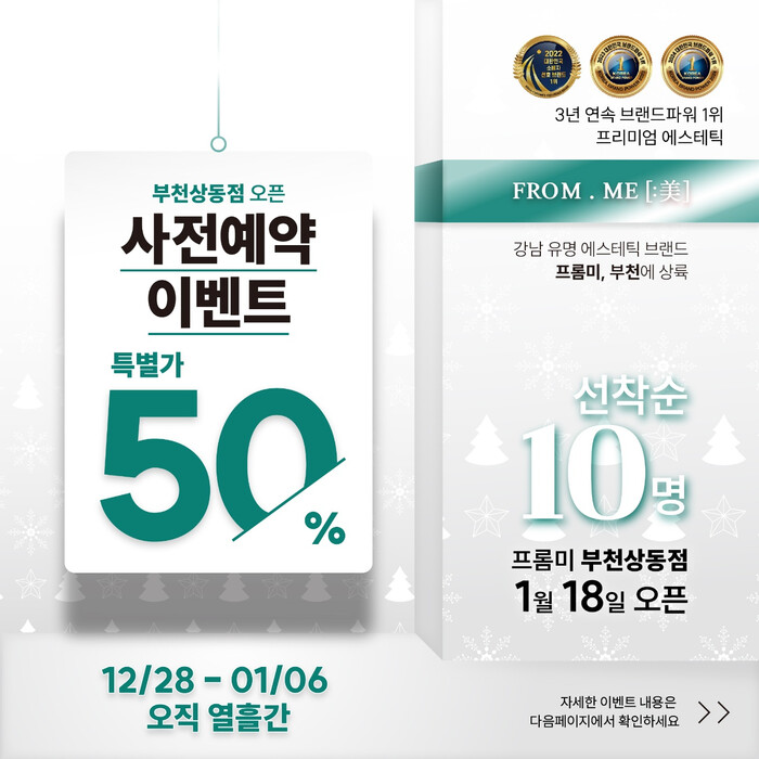 뷰티 전문 프랜차이즈 브랜드 프롬미에서 내년 1월18일 프롬미 부천상동점 오픈을 기념하여 오는 28일부터 2025년 1월6일까지 선착순 10명에게 사전예약 이벤트를 진행한다고 알렸다.