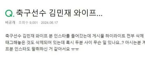 해당 게시물은 지난 6월 포털사이트 네이버 '지식인'에 올라온 '축구선수 김민재 와이프'라는 제목의 글로, 당시 "축구선수 김민재 와이프분 인스타를 들어갔는데 게시물, 하이라이트 전부 삭제됐고 프로필에 김민재를 태그한 것도 사라졌다"고 밝혀 눈길을 끌었다.