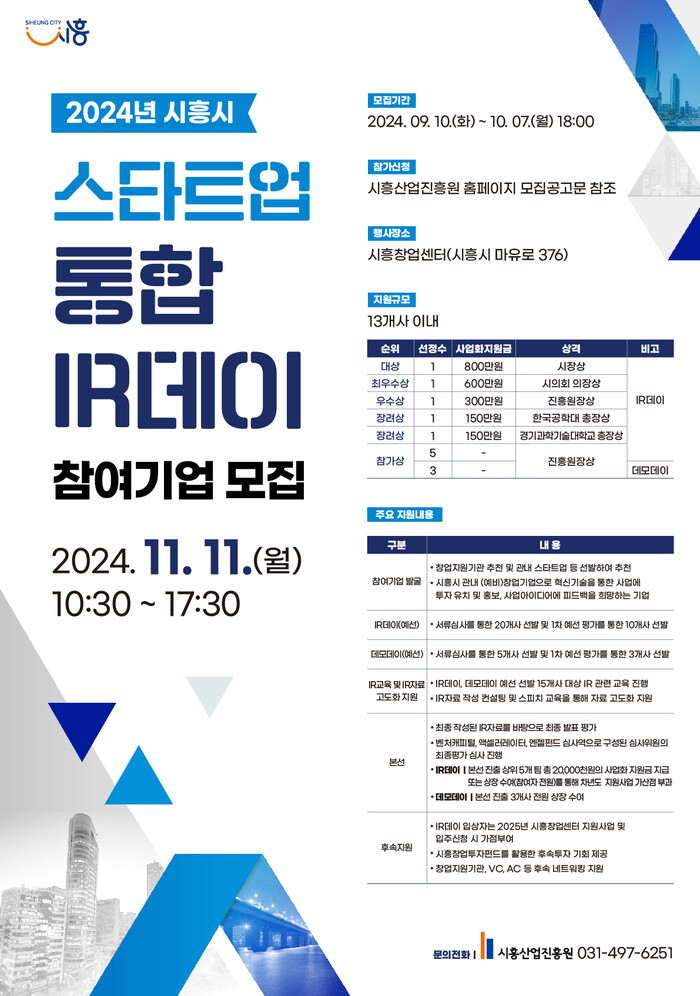 한편,‘2024년 시흥시 스타트업 통합 IR데이 및 데모데이’는 관내 스타트업을 발굴하고, 투자유치 기회 제공을 위해 개최되는 행사로 오는 11월 11일 (월) 개최 예정이다.