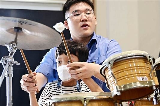 | ▲ 3함대 군악대원들이 은광학교 학생들에게 악기를 지도하고 있다. (사진제공=조원혜 중사). |
