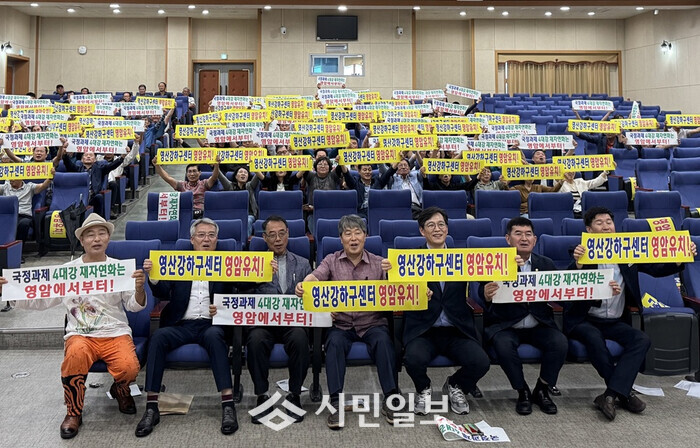 이어 영암지부 회원들은 ‘영산강하구센터 영암 유치’ ‘국정과제 4대강 재자연화는 영암에서부터’ 등의 문구가 적힌 현수막을 펼치며 구호를 외치는 퍼포먼스를 진행했다.