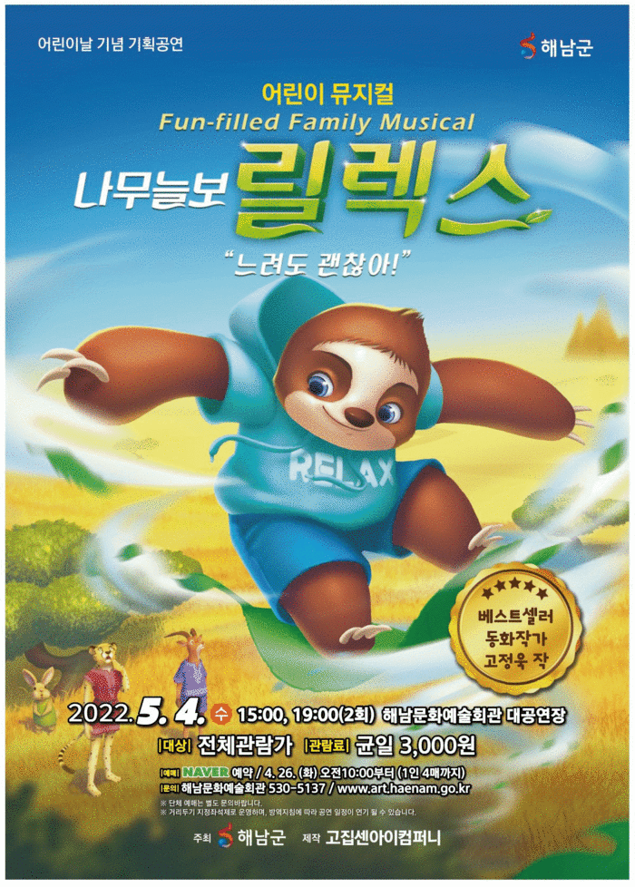 ‘나무늘보 릴렉스’는‘가방 들어주는 아이’,‘까칠한 재석이가 돌아왔다’ 등 베스트셀러 작가 고정욱의 동화를 뮤지컬화한 작품이다.