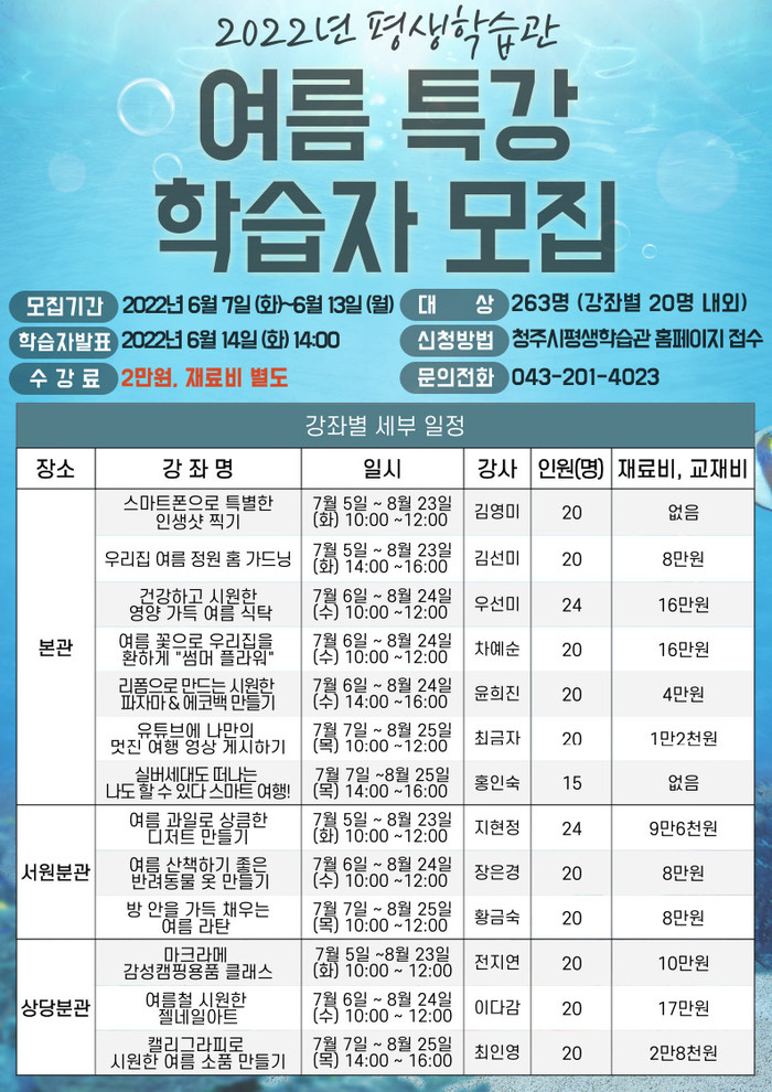 청주시평생학습관이 무더운 여름철 배움의 장 마련을 위해 오는 6월 7일부터 13일까지 ‘2022년 여름 테마특강 프로그램’에 참여할 학습자 263명을 모집한다.