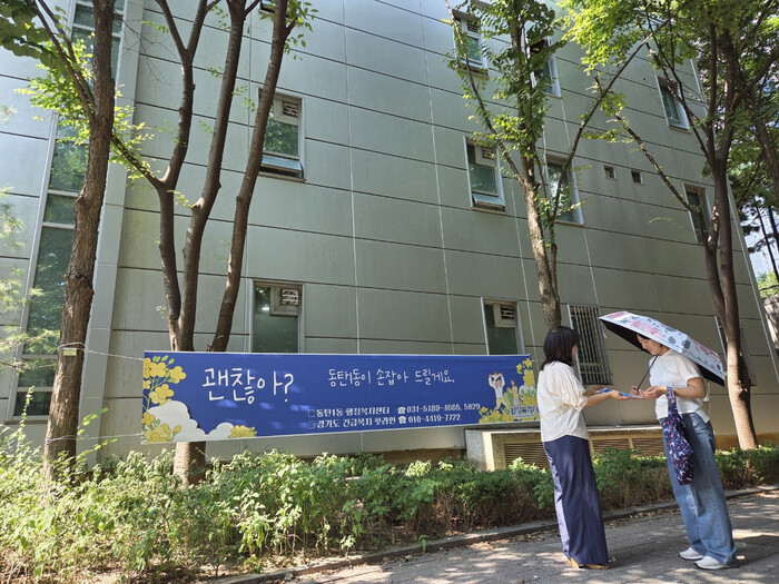 현수막에는 “괜찮아? 혼자 하면 ‘벽’이지만 함께하면 ‘문’이 됩니다.”, “괜찮아? 동탄1동이 손잡아 드릴게요.” 등 위기 시 도움을 요청할 것을 유도하는 따뜻한 문구가 담겨있다.