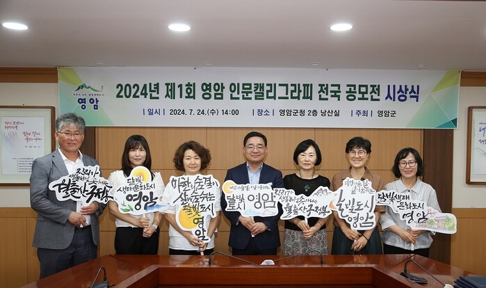 | ▲ 영암군, 지난 24일 군청에서 ‘제1회 영암 인문 캘리그래피 전국 공모전’ 수상작 시상 기념촬영 / 영암군 제공 |