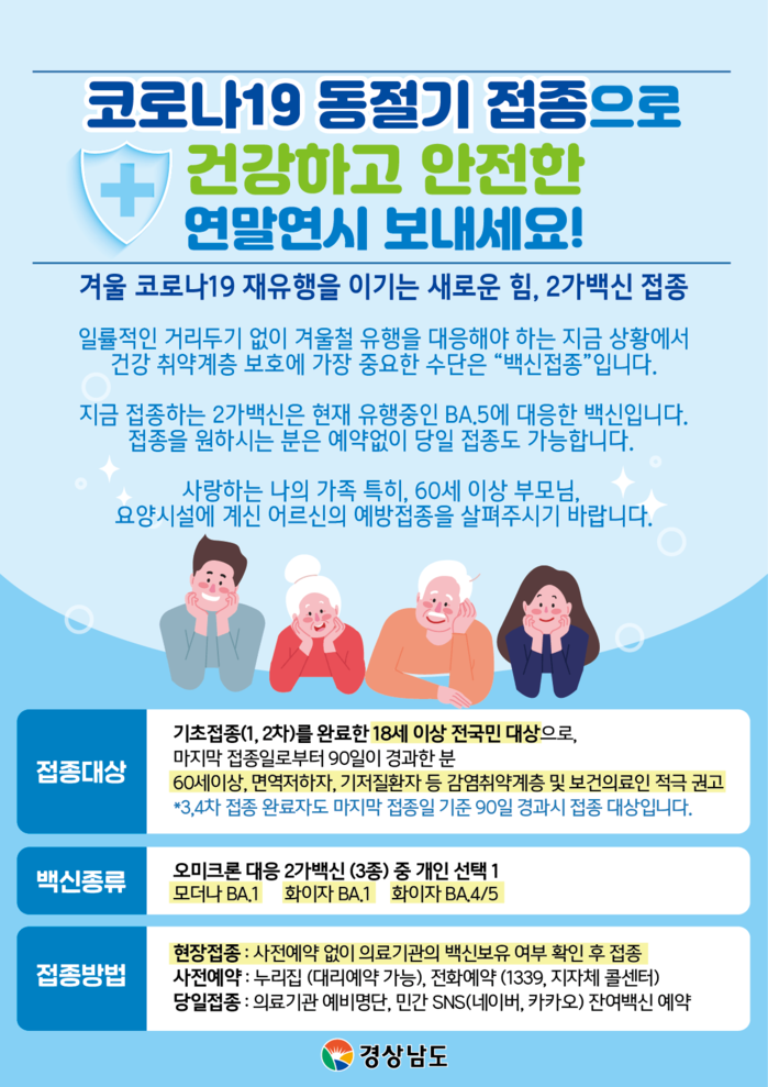 특히, 60세 이상 연령층과 감염취약시설 입소자·종사자는 코로나19 위중증 및 사망의 위험성이 높은 만큼 이번 오미크론 변이 대응 백신 접종 적극 권고 대상이며 감염취약시설인 요양시설 입소자는 2가백신을 접종해야 외출 또는 외박이 가능하다.