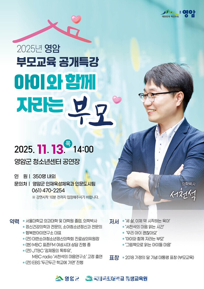 서 박사는 ‘어쩌다 어른’, ‘걱정 말아요 그대’ 등 다양한 방송과 강연으로 대중과 소통해 온 정신건강 전문가로, 이번 특강에서는 ‘아이와 함께 자라는 부모’로 영암군민과 만난다.