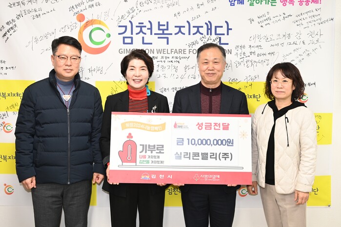 [김천=박병상 기자] 경북 김천시는 지난 10일 실리콘밸리(주)(대표이사 윤경섭)에서 「희망 2024 나눔 캠페인」에 성금 1,000만 원을 전달했다고 밝혔다.