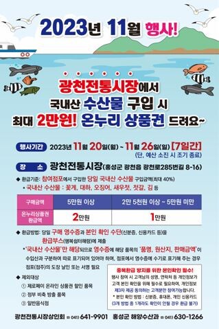 행사는 20일부터 26일까지 7일간 광천전통시장에서 진행되며, 행사참여점포(74곳)에서 당일 국내산 수산물을 구입하면 최대 40%(1인 2만원한도)까지 온누리상품권으로 환급해주는 방식이다.