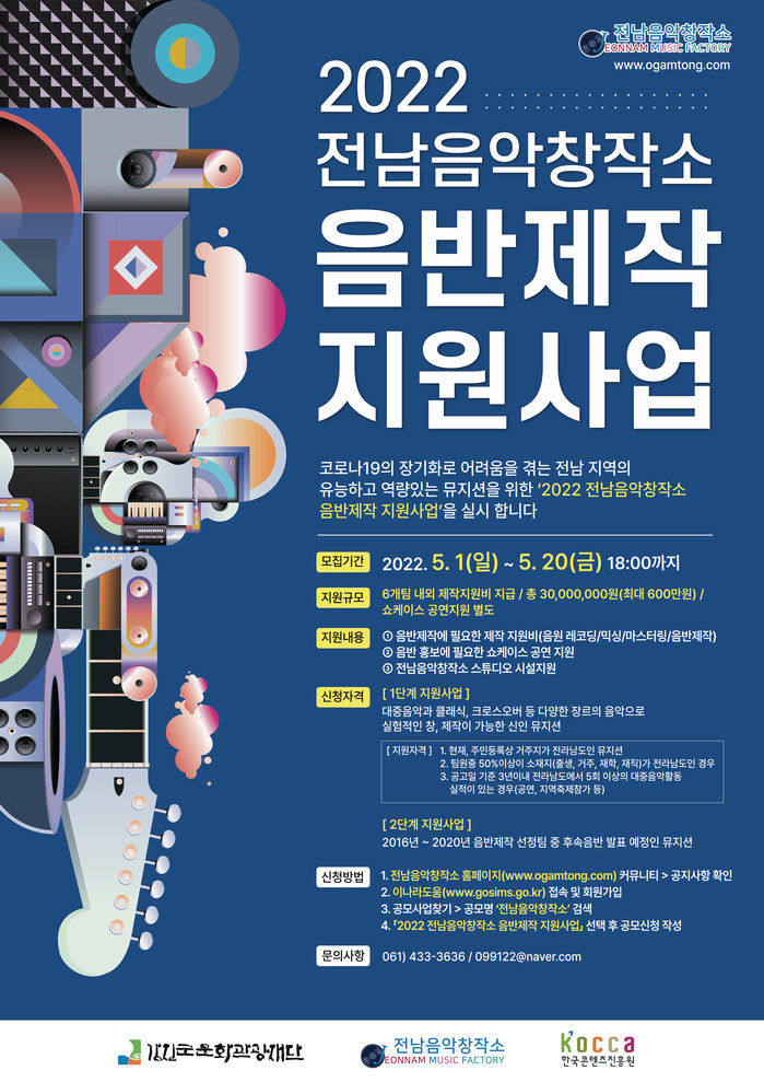 이번 사업은 문화체육관광부와 한국콘텐츠진흥원에서 후원하는 ‘지역기반형 음악창작소 프로그램 운영 지원사업’의 일환으로 전남도 내 뮤지션을 대상으로 약 5개월 동안 음반제작 및 후속 홍보 활동을 지원하는 사업이다.