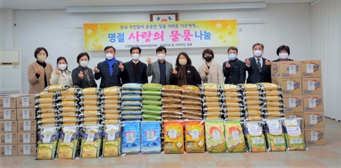 산정동에는 자생조직과 지역사회보장협의체의 회원들은 물론, 산정교회(목사 한해식), 유달종합광고(대표 은성호), 한국전기안전시스템(대표 임현택), 조약국(대표 조기석), 가위소리(대표 박희숙)에서 기부에 동참해 백미 160포, 전기장판 23개, 라면 10상자, 햇반 10상자로, 경로당 10개소, 시설 2개소, 저소득층 190세대에 전달됐다.