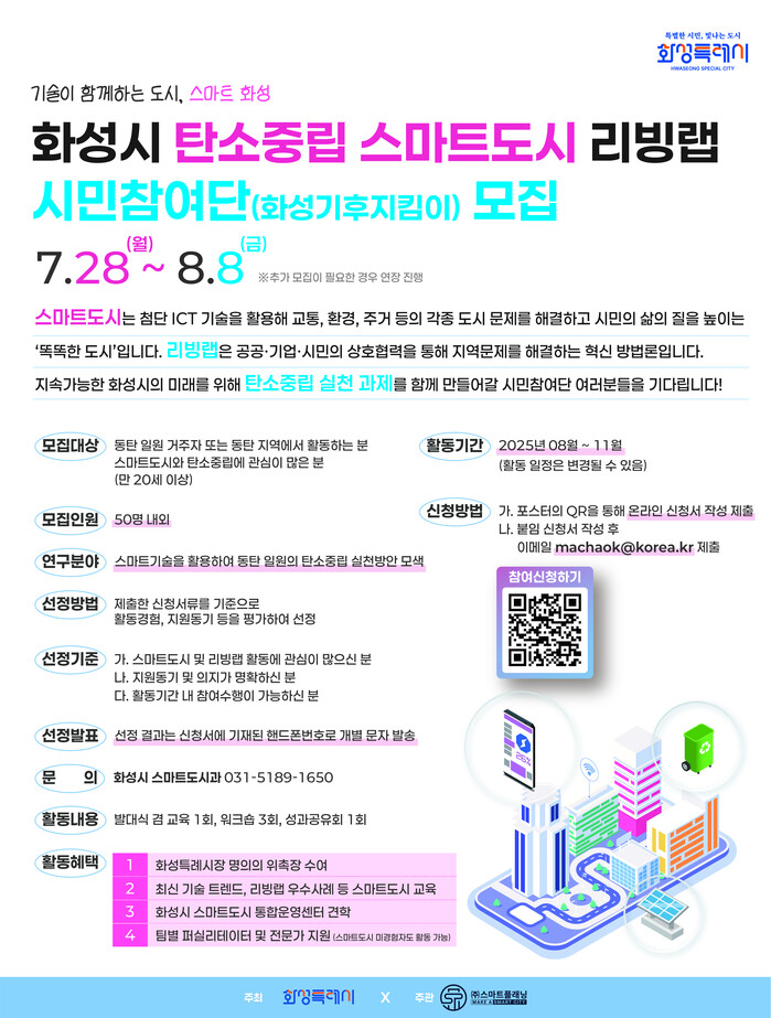 | ▲ 2025년 화성시 탄소중립 스마트도시 리빙랩 시민참여단(화성기후지킴이) 모집 포스터 /자료제공=화성특례시 |