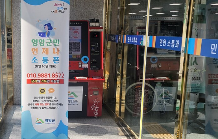 | ▲ 영암군청 민원봉사과 앞에 세워진 ‘영암군민 언제나 소통폰’ 홍보 이미지 / 영암군 제공 |