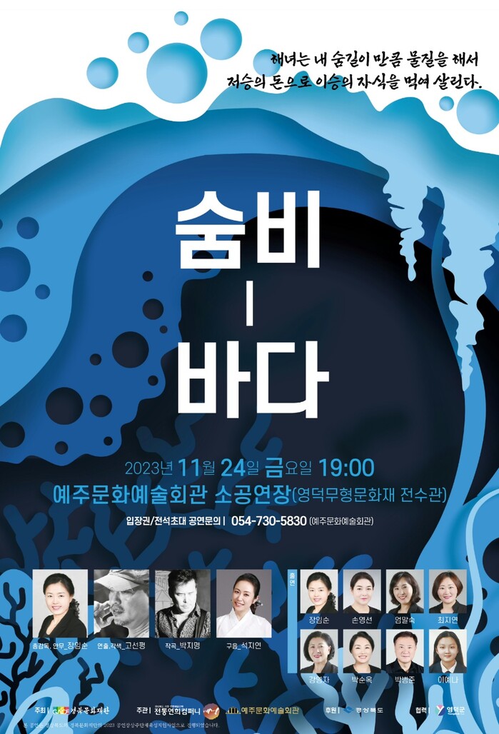 [영덕=박병상 기자]경북 영덕문화관광재단은 예주문화예술회관 상주단체인 전통연희컴퍼니 [예심]의 창작연희극 <숨비-바다>를 11월 24일 영덕무형문화재전수관 소극장에서 공연한다고 전했다.