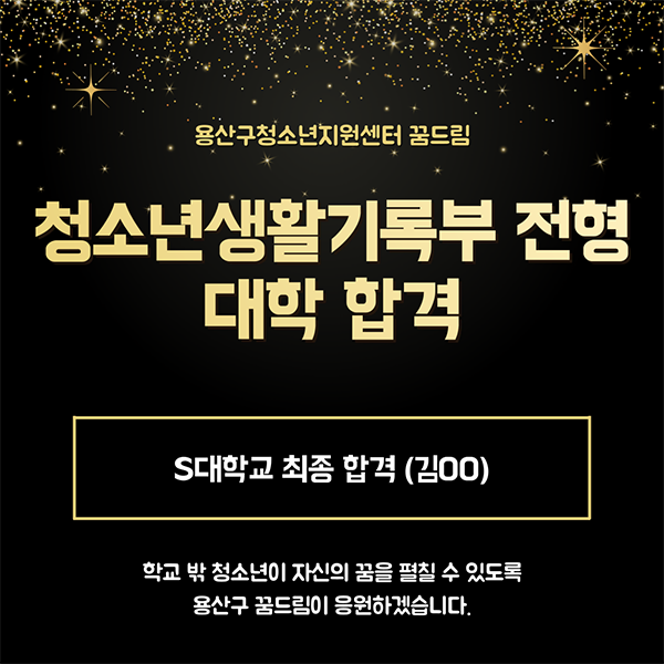 학교 밖 청소년 김OO(20)씨는 수시전형으로 대학에 진학하기 위해 작년 초, 용산구 꿈드림을 찾았다. 꿈드림에서는 학생생활기록부를 대체할 수 있는 청소년생활기록부를 작성해 주었고 이를 토대로 입시를 준비하여 올해 S대 대학진학에 성공했다.