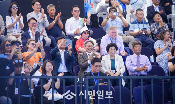 | ▲ 강기정 광주광역시장이 지난 9월10일 5·18민주광장 특설경기장에서 열린 '광주 2025 현대세계양궁선수권대회' 리커브 혼성 단체 결승전을 관람하고 있다./광주광역시 제공 |