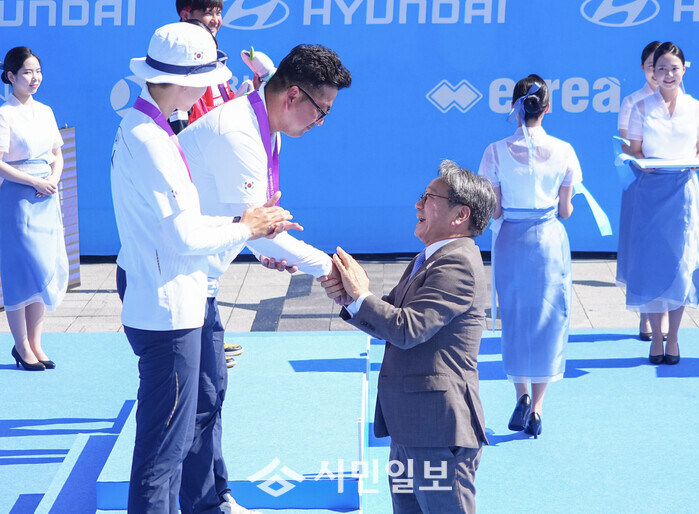 | ▲ 강기정 광주광역시장이 지난 9월10일 5·18민주광장 특설경기장에서 열린 '광주 2025 현대세계양궁선수권대회' 리커브 혼성 단체 결승전에서 준우승을 차지한 김우진·안산 선수에게 메달을 목에 걸어주고 축하를 하고 있다./광주광역시 제공 |