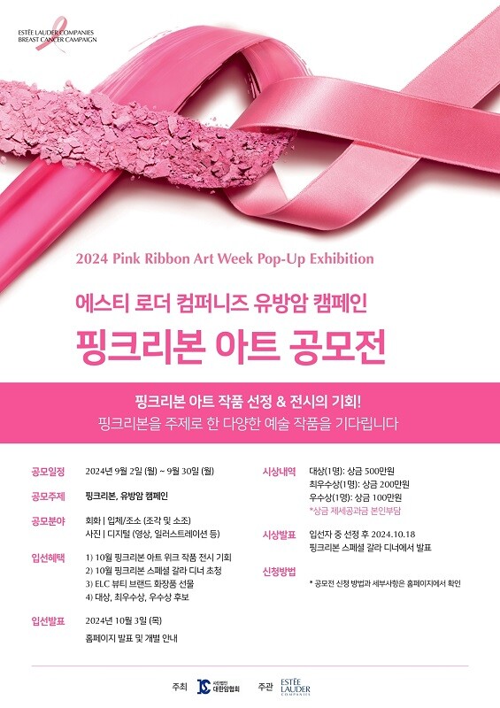 에스티 로더 컴퍼니즈의 유방암 캠페인의 일환으로 대한암협회와 함께 진행하는 이번 '핑크리본 아트 공모전'에는 회화, 입체, 조소, 사진, 디지털 등 다양한 작품 영역에서 참여할 수 있으며 핑크리본에서 영감을 받거나 '핑크리본'을 주제로 한 작품을 공모전에 출품 가능하며 성인 누구나 참여할 수 있다.