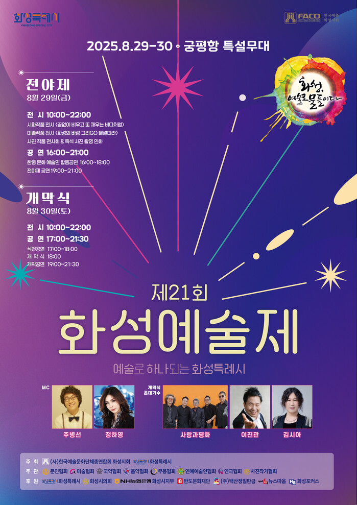 행사는 29일 전야제를 시작으로, 30일 개막식에서는 MC 주병선, 정하영과 함께 초대가수 사랑과평화, 이진관, 김시아가 무대를 빛낼 예정이며, 이외에도 화성예총 산하 지부별 대표 행사와 프로그램이 준비돼 있다.