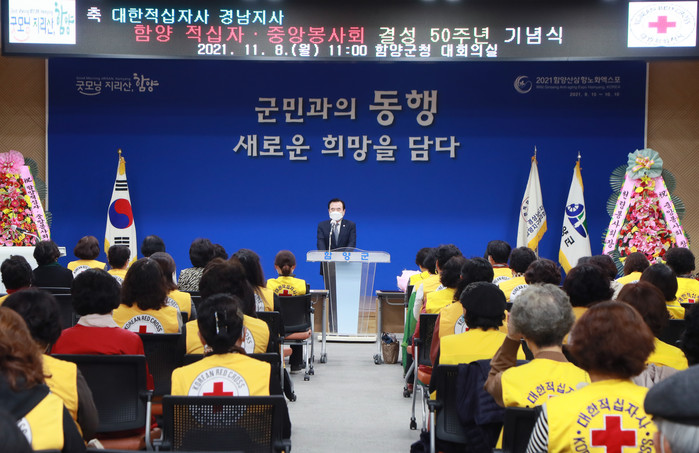대한적십자사 경남지사 함양중앙봉사회 결성 50주년 기념식이 8일 오전 서춘수 군수, 황태진 군의장, 김재웅 도의원, 대한적십자사 경남지사 임군빈 사무처장, 이경숙 함양지구협의회장, 이정자 함양중앙봉사회장을 비롯한 내외빈 80여명이 참석한 가운데 열렸다.