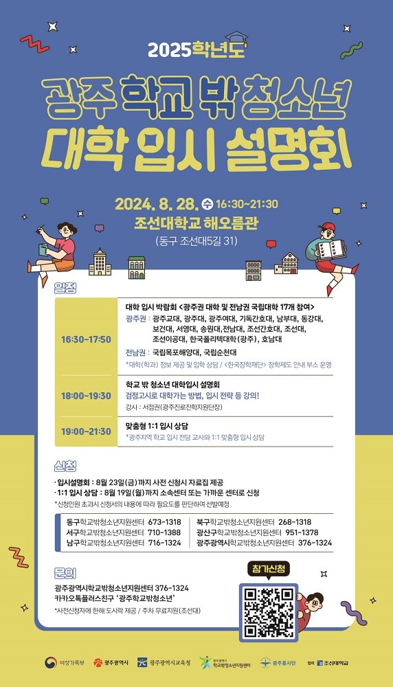 이번 입시설명회 사전 신청은 23일까지 광주시학교밖청소년지원센터 누리집(알려요)을 통해 가능하다. 사전신청자를 대상으로 자료집을 배부할 예정이다. 사전 신청을 하지 않더라도 현장 접수를 통해 참여할 수 있다.