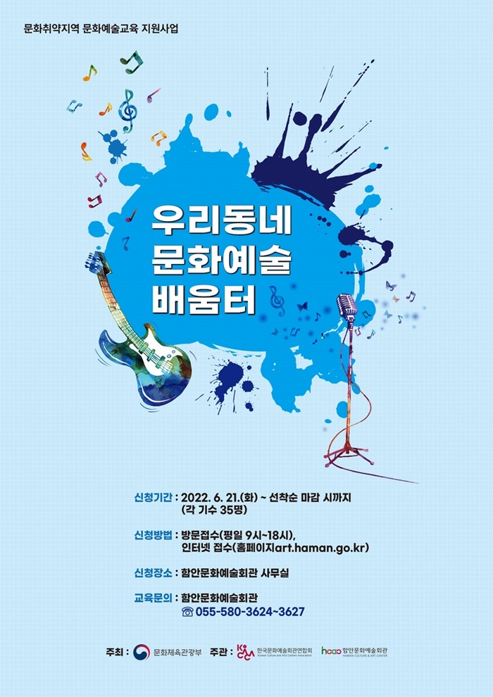 함안문화예술회관은 한국문화예술회관연합회가 주관하는 2022년 문화취약지역 문화예술교육 지원사업 공모 사업으로 추진하는 ‘우리동네 문화예술 배움터’ 수강생을 21일부터 선착순으로 모집한다.