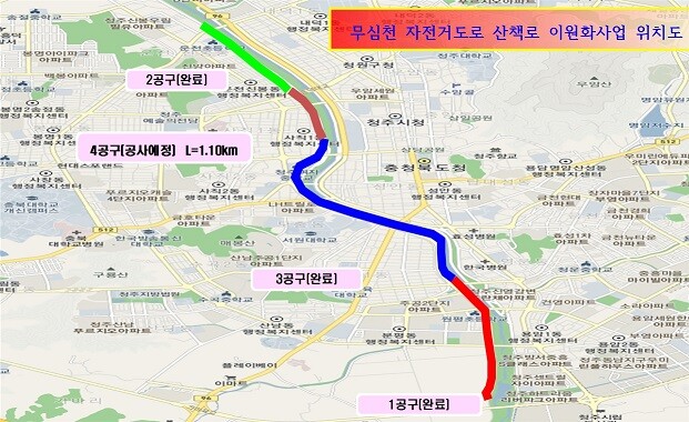 시 관계자는 “산책로 분리공사가 완료되면 자전거 이용자와 산책로이용자 간의 충돌위험 없이 보다 안전하게 여가생활을 즐길 수 있을 것으로 기대된다”라며, “무심천이 더 즐겁고 쾌적한 시민들의 공간이 되도록 최선을 다 하겠다”라고 전했다.