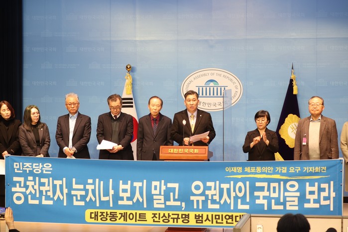 장 대표는 “이번에 국회는 이재명 같은 최대 범죄자를 법적으로 처리할 수 없도록 체포동의안을 부결시킨다면 국회 전체가 해산을 요구하는 국민적 분노에 직면할 것임을 분명히 인식해야 한다”며 “반드시 체포동의안을 가결 시킬 것으로 대장동게이트진상규명범시민연대에서도 강력하게 촉구한다”고 강조했다.