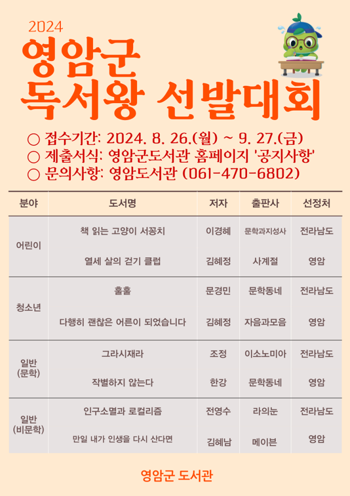 올해의 책과 제출 서류 목록은 영암군도서관 홈페이지 ‘공지사항’을 보거나, 영암도서관로 문의하면 된다.